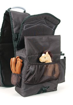 With Water Bottles! Heavy denier insulated nylon with multi-pockets. Unique flap over pocket to keep items from falling out. Two water bottle pockets, carry handle, and adjustable straps for slicker and bedroll. Water bottles included. Buckle closures. Measures: 10 ½" x 10 ½" with 2 ½" gusset.