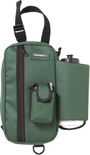From Tough-1 A convenient, durable nylon horn bag with a large zippered pouch and an insulated water bottle holder. Dee ring and adjustable nylon web strap with snap closure for attaching to saddle. Pommel bag includes water bottle. Available in Purple, Black, Blue, Red, Hunter Green (shown above), Brown, Turquoise/Brown and Tan/Brown.