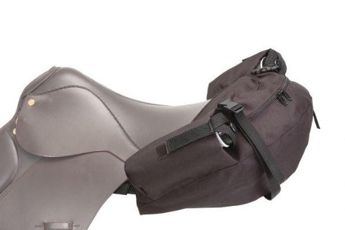 Heavy denier nylon saddle bag with two water bottle pockets. Zipper closure. Finally a good quality saddle bag for the english rider. Nylon straps for easy attachment. Fleece bottom, 32" long, holds two 26 oz. water bottles.